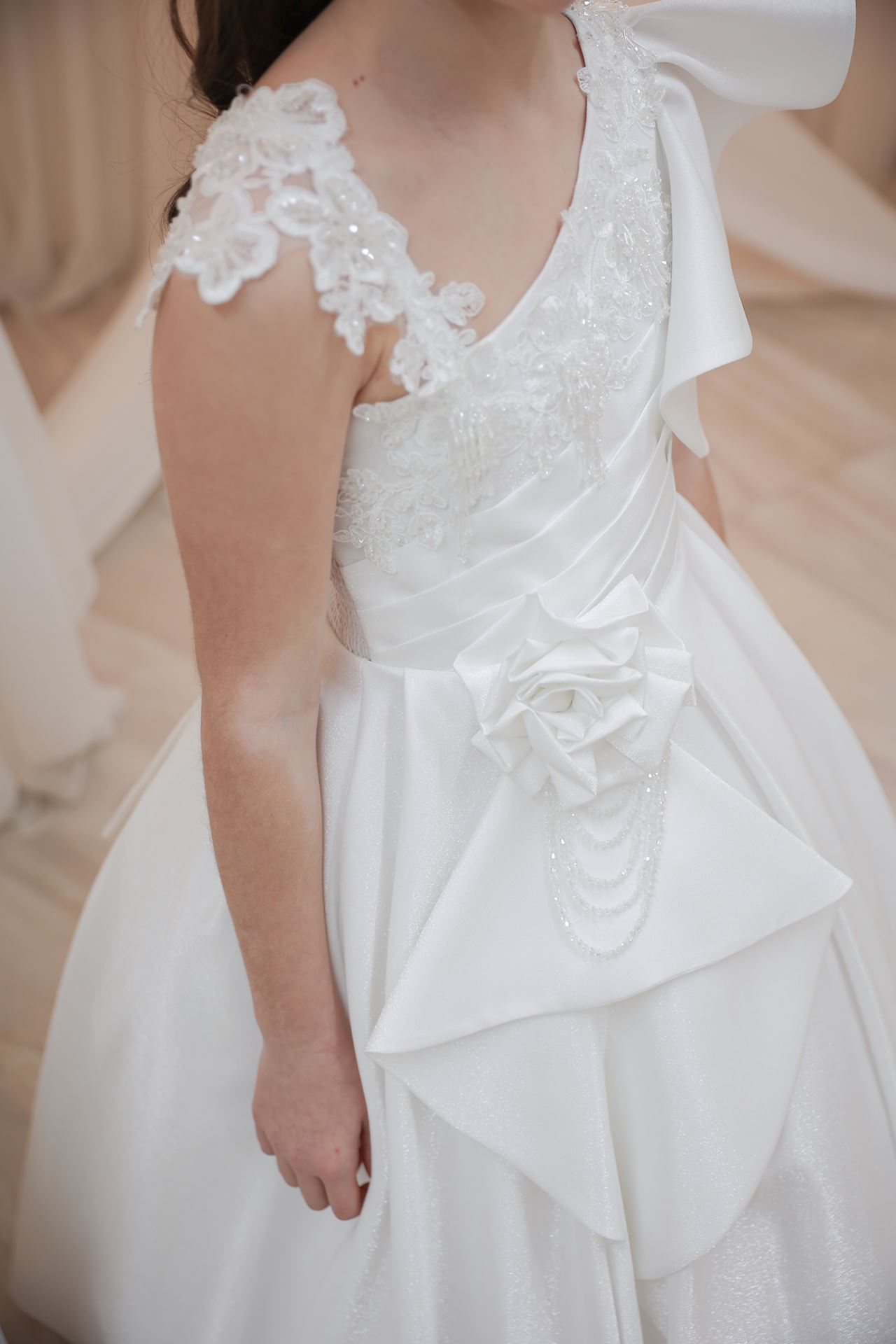 Sahara offers the elegance of off-white in the dazzling texture of satin. The modern line of the asymmetrical collar and the lightness of the sleeveless design adorn the imagination of little princesses.