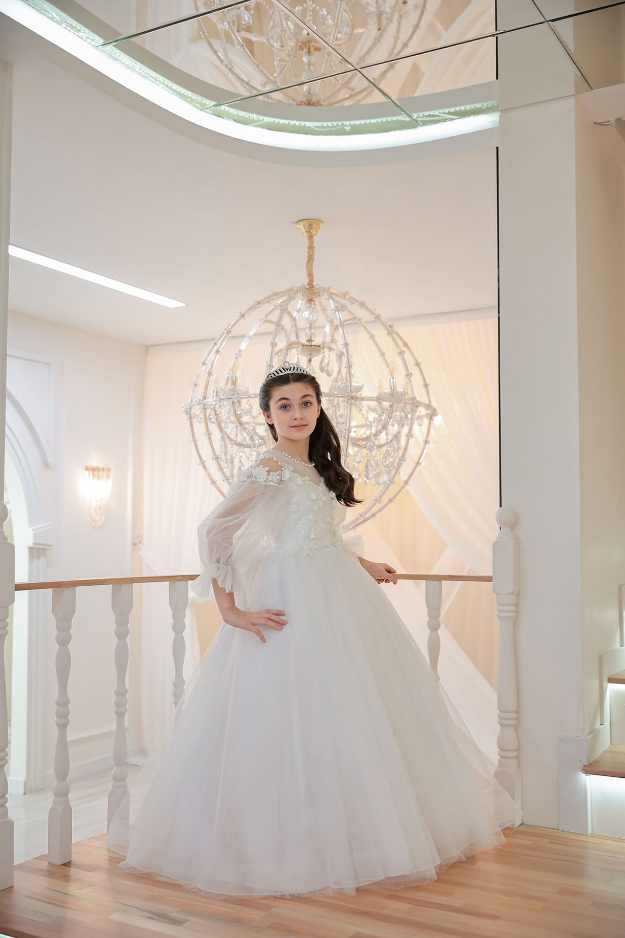 Sicily hides the innocence of off-white in the light texture of tulle. The round neckline and lantern sleeve design adorn the fairytale world of little princesses.