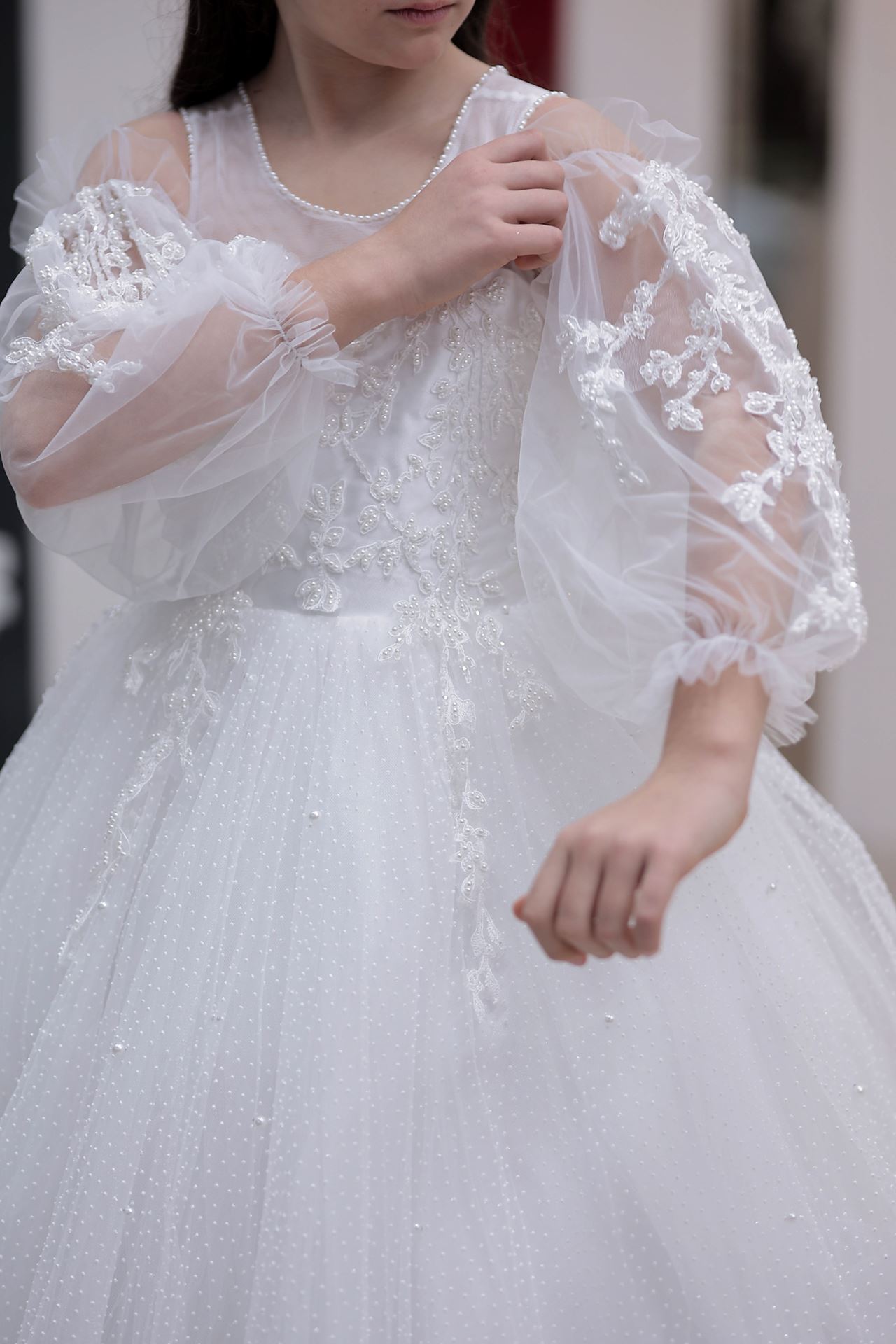 Genewa śpiewa pieśń koloru złamanej bieli do melodii ramion latarni. Delikatny dotyk okrągłego dekoltu tańczy z marzycielską lekkością spódnicy typu Princess.
