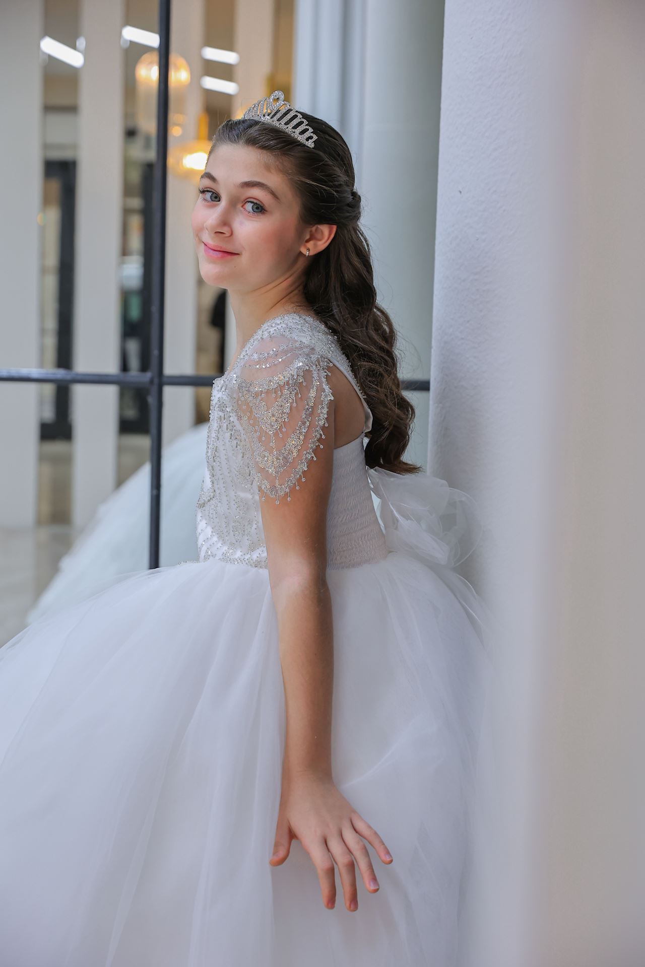 Iris kryje w sobie elegancki świat złamanej bieli w fascynującej fakturze tiulu. Klasyczna linia okrągłego dekoltu połączona z elegancją fasonu bez rękawów zdobi baśniowy świat młodych księżniczek.